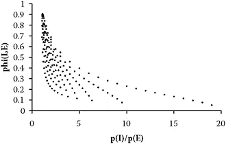 As the predictive validity of a test can be expressed as the correlation between test results and actual health status, this Bayesian analysis shows that the ceiling of validity coefficients becomes lower as the two base rates become more discrepant. In Figure 1.1 the maximum correlations are plotted against the ratio of the base rates. Data for this illustration were constructed by letting p(I) range from .05 to .95 and letting p(E) range from .05 to p(I). Across the simulated instances, the correlation between the base rate ratio and their maximum statistical association is â.65. When the natural logarithms of the ratios are used to reduce the biasing effect of nonlinearity, this correlation is almost perfectly negative (r = â.81).