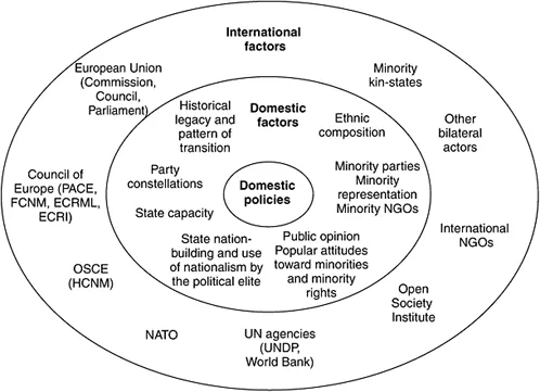 Furthermore, minority rights policies and politics are the result of a complex set of domestic and international factors. At the domestic level, these factors include the historical legacy and pattern of transition from communism, domestic political constellations, the process of state nation-building, state capacity, public attitudes towards minorities and minority rights, and the political organization and representation of minorities. At the international level, the conditionality, interest and pressure of Western organizations, and minority âkin-statesâ and international non-governmental organizations (NGOs) have an impact on minority rights policies and politics in the region (Figure 1.1).