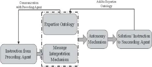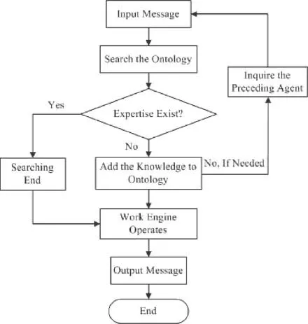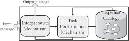 Figure 5 shows the ontology model of an agent. The expertise ontology stores the domain knowledge that is implemented using the JAVA programming language as “if/then” rules (Jia et al. 2004). Figure 6 displays the operation process of an agent. The interpretation mechanism performs message translation. The current agent receives the output message of the preceding agent as input message and translates this message. After a solution has been generated, the solution information is packaged as an output message and passed to the succeeding agent. The task performance mechanism is carried out based on the linguistic instruction in the input message of the preceding agent and the evaluation rules, which are retrieved from the expertise ontology. The data flow is shown in Figure 7.