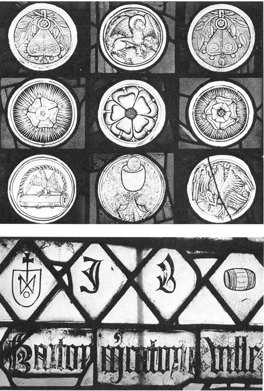 Fig. 15 Badges and devices: (above) TATTERSHALL (Lincs.): roundels with Yorkist and religious devices and the badge of Ralph, Lord Cromwell, c. 1480–2; (below) merchant’s mark, initials and barrel rebus of John Barton (d. 1491) at HOLME-BY-NEWARK (Notts.).