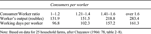 The technical conditions were important, but needed to be considered in conjunction with the contrasted social conditions of production in capitalist and household labour farms. Here Friedmann drew on the work of Aleksandr Chayanov (1923, 1925, 1966), who had used the same zemstvo data as Lenin, but relied also on inquiries by himself and his colleagues and students. Chayanov found the demographic stage of a household, as it first grew and then declined after the young became independent, to be dominant in bringing about differentiation between family farms, whatever their degree of commercial orientation.4 He concluded that the balance between consumers and workers within the household was the main determinant of the scale of production. In Table 1.1 we adapt his oft-quoted (and oft-misunderstood) table summarizing results in the district of Volokolamsk, west of Moscow.
