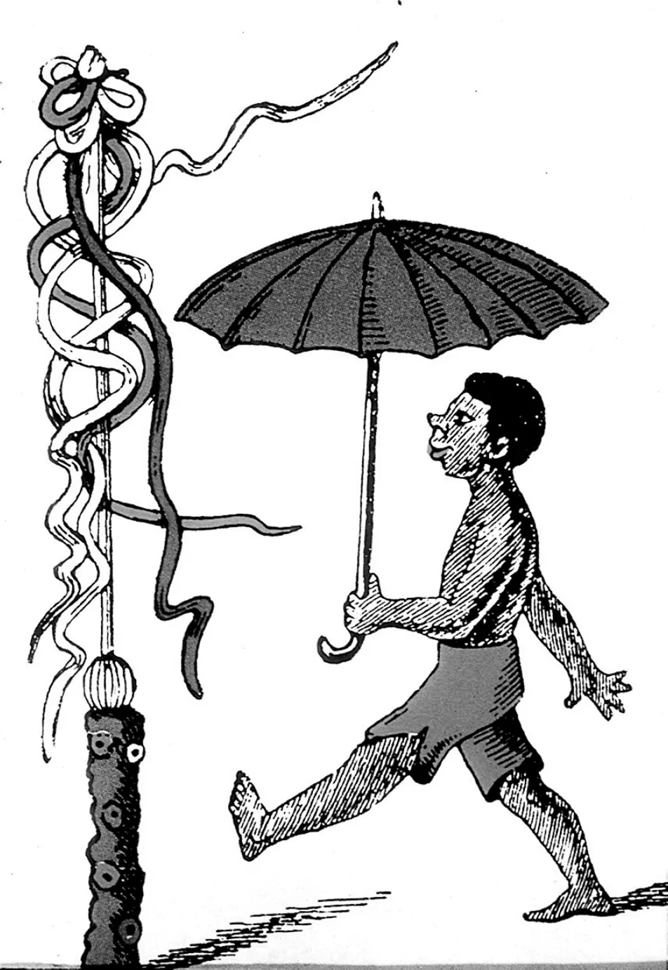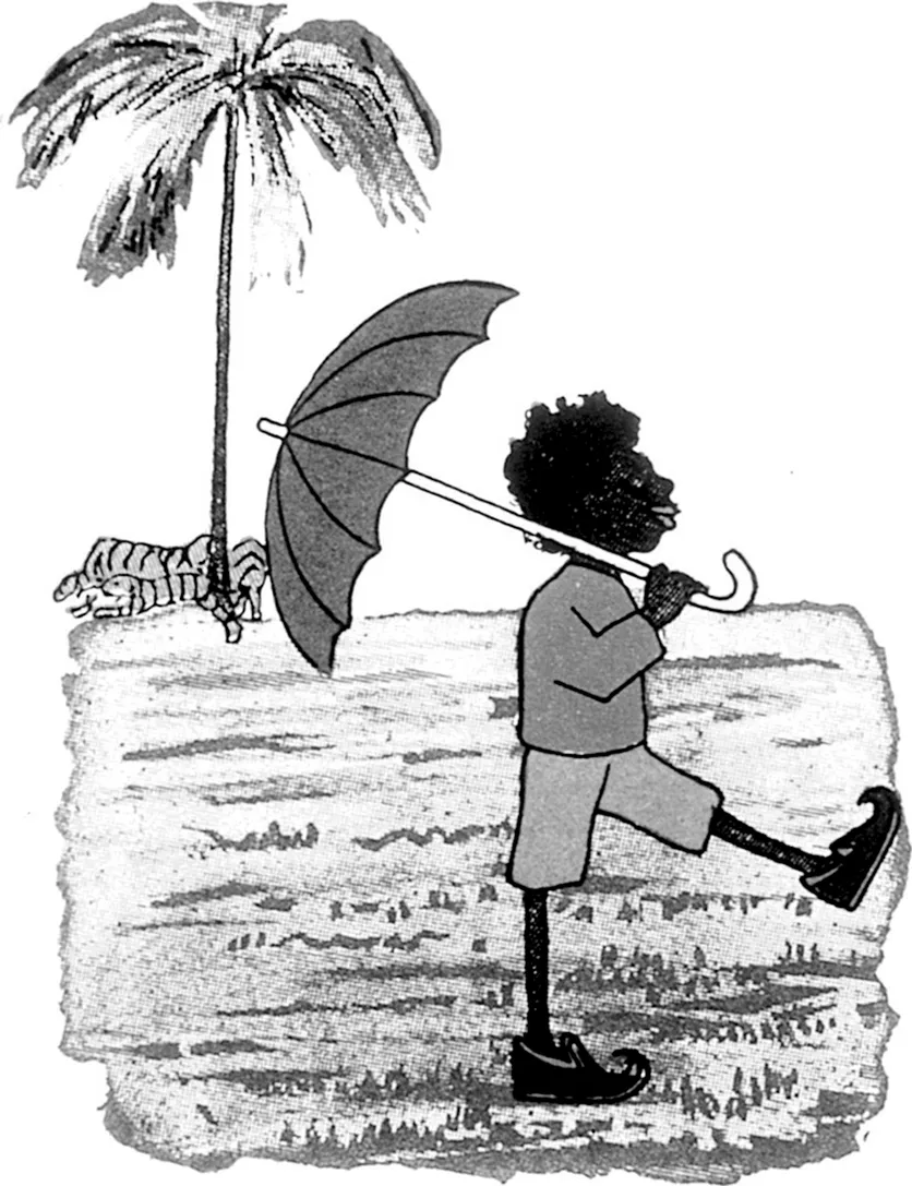 Both children have dark skin, curly or Afro hair, and bright red lips. Both carry green umbrellas and wear a red garment. Even their body positions look similar: the illustration of Little Black Sambo walking home after regaining possession of his clothes mirrors the image of the Black-a-moor before and after his encounter with the three ruffians.1 The Black-a-moor wears only a pair of red shorts, and after Samboâs encounter with the tigers, he spends six illustrated pages in the same near-naked state as Hoffmannâs Black-a-moor. Both amateur artists, Bannerman and Hoffmann illustrated these books with crude, somewhat surreal, and perhaps even childlike sketches.