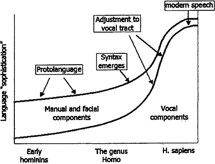 by an increase in brain size, the invention of stone tools, and the beginnings of multiple migrations out of Africa, and it is likely that language became increasingly sophisticated from then on. For most of this period, language would have been primarily gestural, although increasingly punctuated by vocalizations. An indirect evidence of the gestural origin of language is that articulate speech would have required extensive changes to the vocal tract along with the cortical control of vocalization and breathing. The evidence suggests that these were not completed until relatively late in the evolution of the genus Homo (see Fig. 1.1, from Corballis, 2002:118).