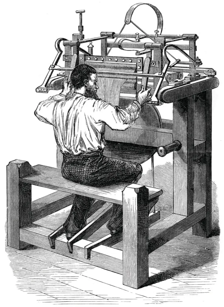 In 1589, the Reverend William Lee invented the stocking knitting frame, which was to revolutionize the knitwear trade. Initially created for use with the short, fine sheepâs wool from Sherwood Forest, this first machine produced coarse knitting for peasant hose. Lee was unsuccessful in promoting the frame; Queen Elizabeth refused the patent because she feared that it would jeopardize the hand-knitting industry. Lee then developed the frame to be used with silk: the original machines had eight needles per inch; this new machine was thought to have twenty needles per inch, and it was perfect for making expensive, fancy stockings. The English were still not interested, and Lee took the frame to France, where the machine eventually proved to be successful. By the end of the seventeenth century, it was in increasingly extensive use across Europe. Knitting had become faster, because now, instead of knitting one stitch at a time, whole rows could be knitted at once. The machine was gradually refined further, and by the eighteenth century, the idea of knitting holes opened up new scope for design. By the late nineteenth century, the knitwear industry was huge; new innovations in technology paved the way for the straight bar, flat frame.