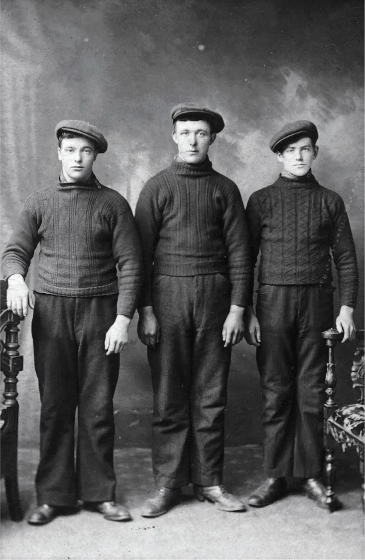 Shetland fishermen wearing individually patterned hand-knitted ganseys in worsted yarn, circa 1900.