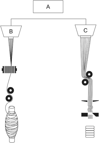 FIGURE 2.1 Melt spinning (A) with either continuous-filament processing (B) or staple-fibre processing (C). Re-drawn by JW.