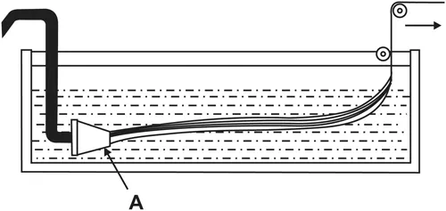 FIGURE 2.2 Wet spinning (viscose), A = spinneret. Re-drawn by JW.