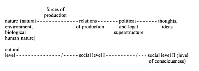 The forces of production are the mediating element between the level of nature and the relations of production. These relations, together with the 'political and legal superstructure' are in turn separate from the 'forms of consciousness'. It is this intermediate level that can be termed the 'social level I' as distinct from and not reducible to the β also social β level of consciousness (which can be designated as social level II).