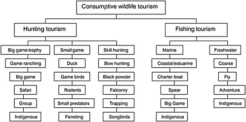 As a niche tourism product, namely a small specialised sector of tourism which appeals to a well-defined market segment, CWT fits into the broader nature-related macro-niche of wildlife tourism (Novelli and Humavindu 2005). Wildlife tourism includes activities classified as ‘non-consumptive’; that is, wildlife viewing, photography, feeding and interacting in various ways, as well as ‘consumptive’ activities. The latter may include killing or capturing wildlife, i.e. hunting, shooting or fishing. The most popular forms of CWT are illustrated in Figure 1.1. Bauer and Herr (2004) use the hunting/fishing dichotomy, and sub-divisions based upon game and/or habitat. Their representation is useful for showing the diversity of forms of CWT. For the purposes of this book, CWT is defined as a form of leisure travel undertaken for the purpose of hunting or shooting game animals, or fishing for sports fish, either in natural sites or in areas created for these purposes.
