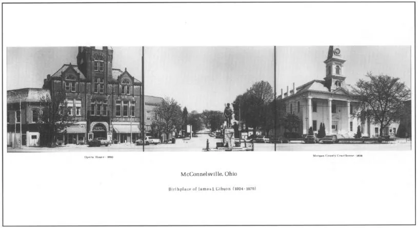James Jerome Gibson was born on January 27, 1904, in McConnelsville, Ohio, at the home of his Grandmother Stanbery. His mother, nĂ©e Mary Gertrude Stanbery, had previously had two stillborn infants, so this healthy son was cherished by his parents, grandmother, and a great aunt, Miss Mary Merriam, a tiny maiden lady. Both of these women later lived with the Gibson family. McConnelsville is a small town in southern Ohio on the Muskingum River near the farm of the Stanbery forebears where Gertrude Stanbery Gibson grew up. I happened, in an absurd way, to see the town once. There was a meeting in 1988 at Miami University in Oxford, Ohio, of the Society of Ecological Psychologists, a group inaugurated after Jamesâs death by his followers. I was driven to the meeting by David Lee, an old friend and one-time student of Jamesâs from Edinburgh, Scotland. Accompanying us was Karen Adolph, a graduate student of mine dating from a sojourn at Emory University (she says David was driving her car). As we sped homeward from the meeting along a major turnpike, a crossroad appeared with a sign advising that McConnelsville was 30 miles to the south. David, spotting it, said, âMcConnelsville! Thatâs where Jimmy was bornâletâs go!â He slowed the car and turned south, despite Karenâs and my protests that there was nothing to see. We arrived at the center of a small, old, respectable Midwestern town. âWhereâs the house?â asked David. I assured him that 1 had no idea and anyhow, it would have been his grandmotherâs house; he was only born there because his father was currently being moved to a new post by the Northwestern Railroad, where he served as right-ofcway agent. David persisted and checked with a local historical society, but of course we never found the house. Several years later, after the story had made the rounds, I received a very large framed panoramic photograph of the center of McConnelsville, complete with courthouse, church, war memorial, and so on. Under the picture was an engraved title, âMcConnelsville, Ohio; birthplace of James J. Gibson, 1904â1979â. The photographer was Tom Stoffregen, my old graduate student, by then a professor at the University of Cincinnati, not far away from McConnelsville. The picture now hangs in the faculty room of the Psychology Department at Cornell University.