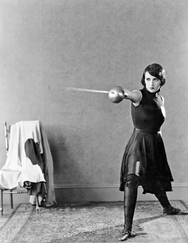As theatre training evolved in both England and the United States, fencing became a requisite asset, along with diction, dance, and general physical fitness, for any actor or actress with professional aspirations. By the early 20th century, fencing matches on stage looked to be merely that, a fencing match. Regardless of the period in which the play was set, the actors used French foils and adopted the stance of modern competitive fencers, as seen in this 1928 short film from British Pathe: www.britishpathe.com/video/thrust-and-parry/query/fencing