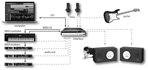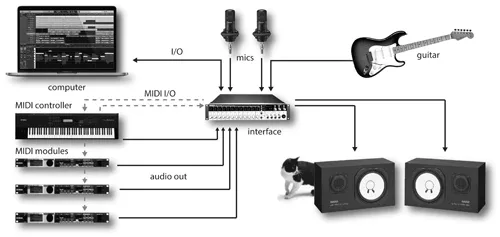 FIGURE 1.4 Example of a typical MIDI system with the audio connections highlighted.