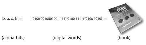 One of the best ways to gain insight into how the MIDI specification works is to compare MIDI to a spoken language. As humans, weāve adapted our communication skills to best suit our physical bodies and brains. Ever since the first grunt, weāve found that itās easy for us to communicate with our vocal cords ⦠and weāve been doing it ever since. Over time, language developed by assigning a standardized meaning to a series of vocalized sounds (words). Eventually these words came to be grouped in such a way as to convey meanings that can be easily communicated ⦠and, finally, written. For example, in order to write down the English language, a standard notation system was developed that assigned 26 symbols to specific sounds (letters of the alphabet) that, when grouped together, could communicate an equivalent spoken word (Figure 1.2). When these words are strung into complete sentences, a more complex form of communication is used that conveys information in a way that has a greater meaning. For example, the letters B, O, O and K donāt mean much when used individually; however, when grouped into a word, they refer to a physical media form that hopefully conveys messages relating to a general theme. Changing a symbol in the word could change its meaning entirely; for example, changing the K to a T within the grouped word makes it refer to a handy thing thatās better off worn on your feet than carried in a backpack (e.g., Dude, is that a book about pirate boots?).