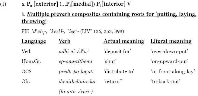 Preverbs and preverbation are two well-studied topics in Indo-European linguistics (cf. e.g. Rousseau 1995; Booij & Van Kemenade 2003; Chapter 3, and references therein), to such an extent that the notion of preverb itself emerged from these fields of study. However, far less attention has been paid to multiple preverb constructions of the type in (1)a-b, in which two or more such morphemes attach onto the same simplex verb. This gap in the literature may occur because the accumulation of preverbs, though possible, does not seem to be the favored procedure in ancient Indo-European languages (Kuryłowicz 1964: 174).
