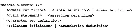A schema must have a name and a default character set, usually ASCII or a simple Latin alphabet as defined in the ISO Standards. There is an optional AUTHORIZATION clause that holds a <schema authorization identifier> for security. After that the schema is a list of schema elements: