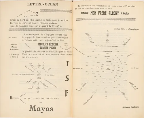 The idea of words-in-freedom had a significant impact on avant-garde artists and poets all over Europe. In Paris, Guillaume Apollinaire, whose poetry already made use of appropriated words and phrases in the manner of cubist collage, was moved to consider his poetry’s visual form. Although Apollinaire later developed his own approach to visual poetry by resurrecting the ancient art of picture poem, as made famous in his Calligrammes (1918), the early visual poem ‘Lettre-Océan’ (1914) clearly shows a futurist influence (Figure 1.2). The poem’s title referred to a particular kind of message sent by telegraph from ship to ship across the ocean. The telegraphic theme was further emphasized by the inclusion of the acronym ‘TSF’, placed prominently near the centre of the composition. Standing for Transmission Sans Fil, or wireless transmission, this was, as Johanna Drucker has suggested, a nod to Marinetti’s idea of the wireless imagination.4 The visual composition certainly broke with the traditional ideal of the smooth grey page. All the different elements were meant to be taken in simultaneously, rather than in a particular order. To achieve this, text was placed according to a schematic logic rather than the conventions of linear top-to-bottom, left-to-right reading. Selected words and phrases, like ‘Mayas’ and ‘mon frère Albert’, were highlighted through the use of bold typefaces. This allowed them to compete for attention with two striking circular devices, the larger of which is meant to depict the Eiffel tower seen from above. Less immediately noticeable elements included a series of wavy rules used to represent water. The text was primarily constructed from fragments of correspondence between Apollinaire in Paris and his brother Albert in Mexico, to which Apollinaire added pieces of onomatopoeia and other elements in order to evoke the two brothers’ physical surroundings.5