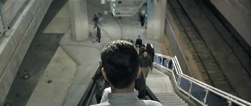The wide-angle reverse shot that succeeds the opening shot reveals an elevated station of elegant recent design, with the train now squeezing away from us to a halt. The shot treats the track lines and the stationās contours ā pierced from below by a stake-like escalator well ā as near-abstract elements. These shots set such a high standard of pictorial quality that already the viewer is confident of watching an exquisitely designed film. (Any sudden foreground sound throughout this hushed opening sequence has that heightened, intrusive quality experienced in the murmur of early morning.) And symbolically we might be aware that we are about to watch a film about two characters who run along set rails through the night, unable to deviate.