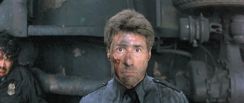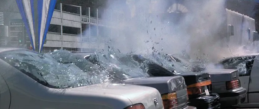 We see McCauley waiting in the ambulance with Shiherlis beside him. A moustachioed Latino man, Trejo (Danny Trejo), calls on a walkie-talkie from his car: heās tailing the target armoured truck, giving a precise run-down as to when it will appear at the chosen spot. It is seconds away. McCauley switches on the ambulance siren and pulls in front of the truck. Cheritto guns his recovery truck into life. It builds up speed as it runs beneath the freeway. Cherittoās rig slams into the armoured truck with such force it upsets the truck onto its side, shoving a whole row of dealer cars several feet back. Thereās a momentās pause as a severed strip of the dealerās blue bunting gently descends.