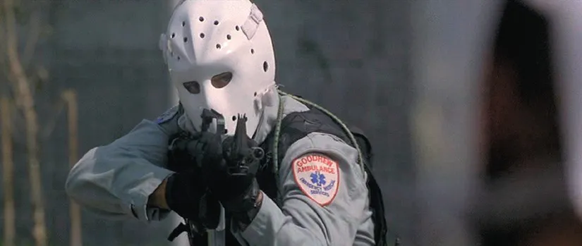 The crew, in metal ice-hockey masks, bulletproof vests and carrying automatic weapons, run to surround the truck, waiting to put a stopwatch on as soon as they hear the police alarm call given out on the radio. Shiherlis (the only one wearing a black mask instead of white) positions an explosive shape charge on the door, stands back and sets it off. The impact shatters the windscreens of the dealer cars. McCauley goes inside and hustles out the three guards whose ears are leaking blood and wax. Waingro guards them while Shiherlis rifles through the packages. Trejo runs a line of tyre-slashers across the street.