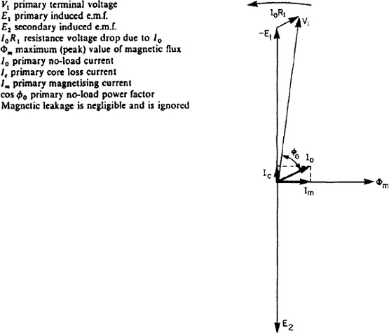 The above expression holds good for the voltage induced in either primary or secondary windings, and it is only a matter of inserting the correct value of N for the winding under consideration. Figure 1.1 shows the simple phasor diagram corresponding to a transformer on no-load (neglecting for the moment the fact that the transformer has reactance) and the symbols have the significance shown on the diagram. Usually in the practical design of transformer, the small drop in voltage due to the flow of the no-load current in the primary winding is neglected.