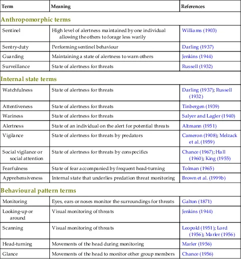 A key feature of the definition is that vigilance can be viewed as a state or behaviour. The state of vigilance, being a predisposition of the brain, cannot be observed directly, but the outward signs, in terms of behaviour, can be observed and measured. I refer to these outward signs of a vigilant state as markers of vigilance. The dichotomy in the definition is reflected by the terms variously used over the years to describe vigilance (Table 1.1). Labels such as watchfulness, wariness, attentiveness and apprehension certainly refer to an internal state that governs how an animal monitors the surroundings for danger. Other labels describe the ways animals actually monitor their surroundings, and fall in the marker family. Terms such as head-turning, scanning, and sniffing convey the observable ways animals use their senses to detect threats. Early researchers described vigilance using terms that are now considered anthropomorphic, such as guarding and sentry-duty, which give the impression that individuals have been assigned a duty by a third party for the benefit of the group. Such terms are avoided nowadays.