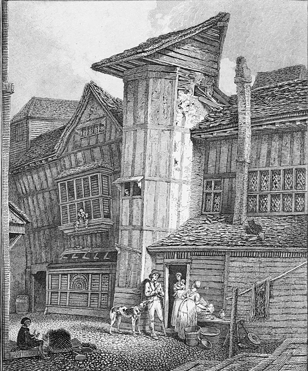 IMAGE 1. This early nineteenth-century drawing of seventeenth-century housing in Moorfields, immediately adjacent to the northwest of Coleman Street Ward, gives us a vivid image of the conditions in which the London poor lived during the era of the English Revolution. Taken from J. T. Smith, Ancient Topography of London (London, 1815). Photo appears courtesy of The Newberry Library (folio F 02455 .798).