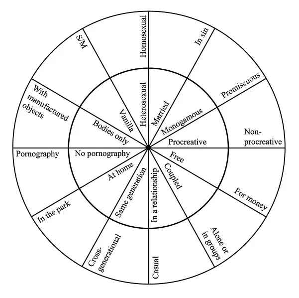 Gayle Rubinâs âcharmed circleâ diagrams how sexual practices interrelate.6 The circleâs inside wedges are mainstream and hegemonic. These practices represent how good moral, normal people have sex. The outside practices oppose these wedges. Society stigmatizes these subversive sexualities. Sex in the outer limits is queer.
