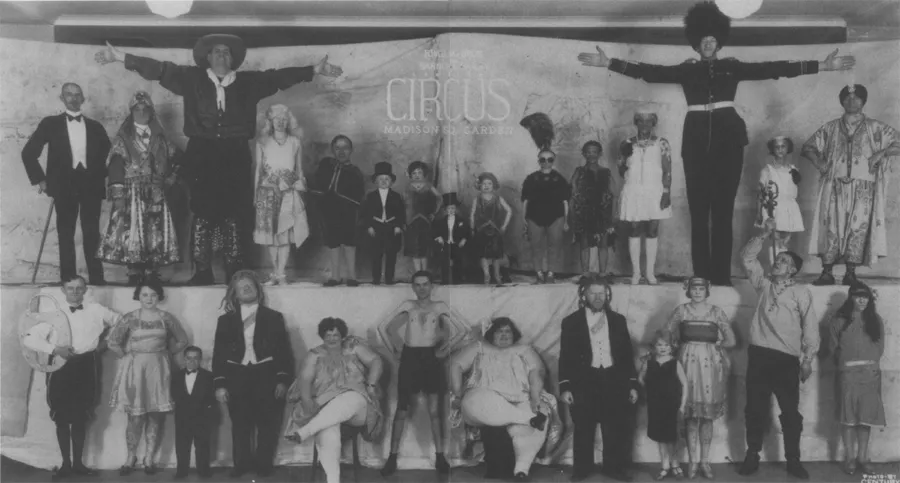 FIG. 1. Jack Earle in the Ringling Brothers, Barnum and Bailey Sideshow. Earle is in the top row, third from the right, wearing a tall hat and military outfit. Other well-known exhibits in the picture include the Doll Family, Koo-Koo the Bird Girl, Clicko the Bushman, and Iko and Eko. Photo by Century, c. 1934. (Hertzberg Coll., San Antonio Public Library.)