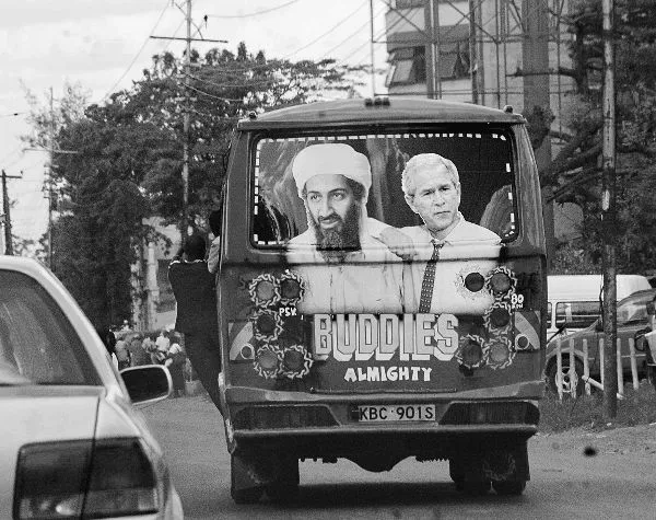 As fewer and fewer owners managed to enter and survive the industryâs consolidation, those who did quickly began to monopolize it. But as bad as this may seem, some of the consequences were beneficial. It was not long before the wealthier owners purchased safer and more comfortable vehicles.13 By the late 1990s, instead of the old, overburdened jalopies, the streets soon entertained new Nissan, Toyota, and Isuzu minivans with ornate paint jobs, air conditioning, and lavish interiors with such luxuries as tinted windows, state-of-the-art sound systems, and eventually flat-screen TVs. Much better than splintery benches bolted to the bed of an old pickup. Still, despite the exclusionary tactics, despite the streamlined routes and all the added comforts, there remained the mad scramble for passengers. So, to lure passengers, matatu operators started to âtrick outâ their vehicles with blaring hip-hop and flamboyantly painted exteriorsâfrom somber black to a Rubikâs-Cube assortment of colors, or with airbrushed creations normally reserved for movie posters or street murals. Each matatu had to be unique. Particularly popular were the names and portraits of American hip-hop artists like Kanye West, Eminem, Ludacris, Jay-Z, or Snoop Dogg; sometimes they promoted political figuresâthere were predictable portraits of Barack Obama, that most honored child of Kenya (in one such image he is kissing his wife, Michelle), but you might also encounter such political absurdities as George Bush sitting beside Osama bin Laden. Regardless, the transformation of the matatu was profound. Just a few generations earlier matatu owners had been repurposing used parts to assemble simple vehicles that could carry a few passengers; now, a few decades after independence, they were adorning large, top-of-the-line vans with personalized artwork and high-tech accessories.14