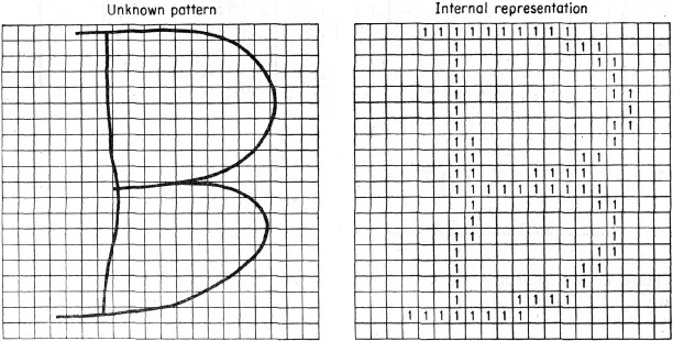 Figure 1. Continuous handwritten letter B versus its digital conversion into discrete symbol as a 20 Ă 20 matrix. From Leonard Uhr and Charles Vossler, âA Pattern-Recognition Program that Generates, Evaluates, and Adjusts Its Own Operators,â in Edward A. Feigenbaum and Julian Feldman, eds., Computers and Thought (New York: McGraw-Hill, 1963), 253.