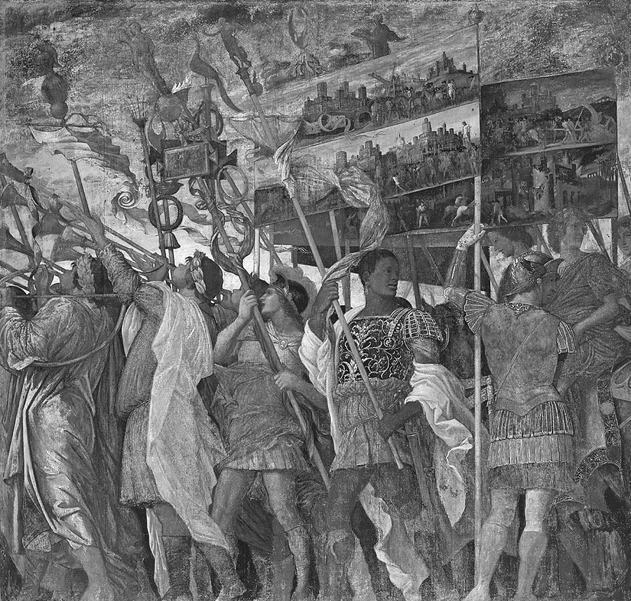 This ghostliness can be understood not only as an effect of time on paint1 but also as a prompt for critical thinking about representation. Notice the paintings held aloft on the banners. Mantegna’s early modern contemporaries were increasingly turning to the study of material objects to learn about the facts of the past, and Mantegna had conducted his own antiquarian research into Roman triumphs.2 Scholars have long believed that Romans did indeed carry such paintings, which portrayed victorious battles as well as the suicides of conquered generals.3 But while these ancient paintings may have offered for the ancient Romans a kind of second-order conquest and possession, Mantegna’s painting does more than this, creating a space for viewers to reflect critically on this earlier aim. The soldiers he paints appear lost in a spectacle of objects. Some look forward at where they are going, others backward at what is behind them. None seems fully cognizant of what is actually going on. The motion of the pennants, whipped around by a wind, suggests relentless change. At one moment, the conqueror is perched at the pinnacle of worldly achievement; at the next, he will be flung to the ground by the downward turn of fortune’s wheel. To put this point historically: parading now in glory in around 46 BCE, Julius Caesar will be assassinated less than two years later. Any sustained examination of this painting thus raises questions about the victory of men and empire that it is ostensibly celebrating.4 Viewers soon find themselves staring past the putatively solid objects into the desire for possession that underlies them: the Romans’ desire for power and the early modern antiquarians’ desire for a history that is graspable, objective, literal, and contained.
