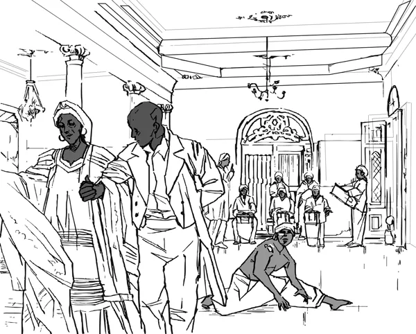 FIGURE 1.1 Sergio HechavarrĂa Gallardo and Maura Isaac Ălvarez perform a CarabalĂ dance as another dancer in the role of a âCongoâ watches, in TrilogĂa africana, by Ballet FolklĂłrico Cutumba, Santiago de Cuba, July 2006. Line drawing by Jessica Krcmarik of still image from authorâs video recording, used with permission.