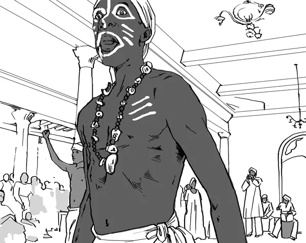 Suddenly, a striking figure appears, moving with fierce energy: Chirri is dressed in loose britches like the other âcongos,â his bare chest is crisscrossed with white strips of cloth and a long pendant, and his cheeks are hatched with painted African âcountry markâ scars, bright white on his dark skin. As he dances around the others, intimidating them, he puffs at a cigar stub and rolls his widened eyes, his face frozen in a fixed stare (see fig. 1.2). He conjures the brujo, witch; he throws the others into paroxysms of possession trance on the floor. He works his dark magic, pulling snakes from a tall, carved wooden vessel that evokes both drum and witchâs cauldron, then duels with a challenger, and after that stalks the very edge of the audience with two thin torches, burning each along the length of his arm. In a nifty theatrical trick, he blows streams of fire from his mouth then extinguishes the flaming wands in his mouth.