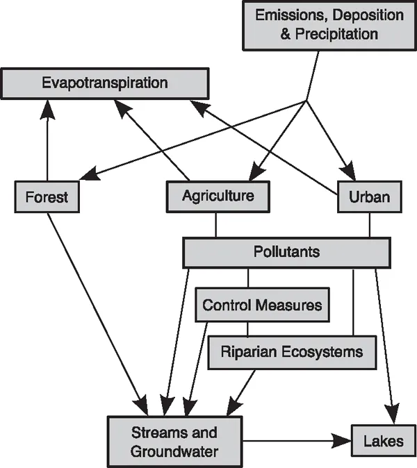 Figure 1.1: Summary of stormwater-related aspects of the water cycle. Part I examines rainfall and atmospheric deposition onto various land use types, setting the background conditions for the various environmental harms, indicated by âpollutants,â to surface waters discussed in Part II. Part III covers solutions to these harms through the use of riparian ecosystems and stormwater control measures.