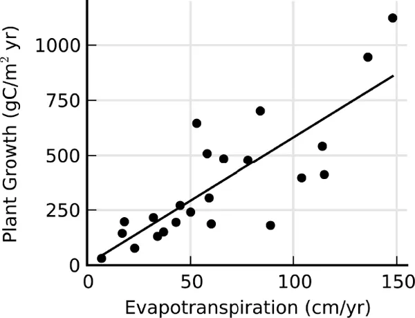 Figure 1.2: Plant growth, more formally called net primary productivity (NPP), increases across 23 ecological areas across the globe with increasing levels of evapotranspiration, which combines water availability and warmth (after Cleveland et al. 1999).