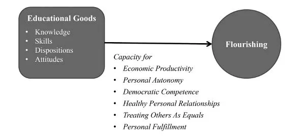 Constructing a comprehensive list of the specific knowledge, skills, dispositions, and attitudes needed to enable people to flourish, and to contribute to the flourishing of others, would be an unmanageable task. The list would be extremely long, and the precise items on it would vary across contexts. But we can identify, at a general level, six capacities that everyone should have in modern societies and which, when deployed effectively in appropriate circumstances, will tend to support the flourishing of both the educated person and others: the capacities for economic productivity, personal autonomy, democratic competence, healthy personal relationships, treating others as equals, and personal fulfillment. These capacitiesâand the dispositions to act on them in the right circumstancesâshould guide decision makers in determining what specific educational goods to foster. Figure 1.2 shows this relationship between educational goods and the capacities that contribute to flourishing.4