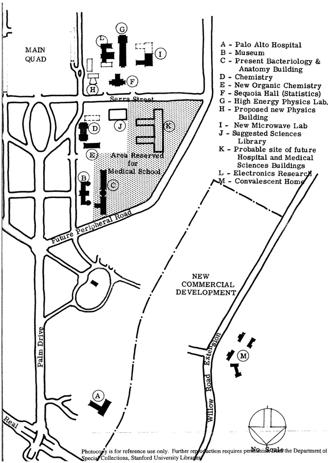 Figure 1.1. Integration of the medical school and the university at Stanford. Stanford president Wallace Sterling presented his plan to relocate the medical school to the main campus at Palo Alto in 1953. The integration was meant to be both geographical and intellectual in nature, heralding Stanford’s commitment to a new biomedical school. Image from “Statement to the Stanford Trustees,” John E. Wallace Sterling Papers, Stanford University Archives, SC 216, box 63. Reproduced with permission, Department of Special Collections, Stanford University Libraries, Stanford University.
