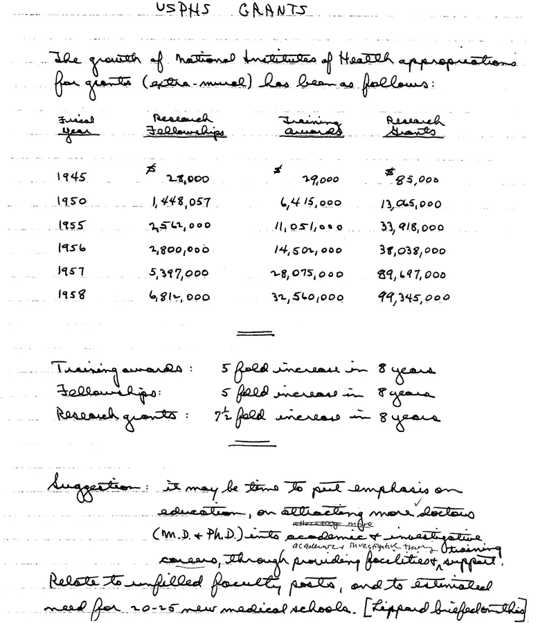 Figure 1.3. Stanford’s memo on the postwar growth of National Institutes of Health (NIH) grants. This memo noted the postwar growth of the NIH’s grants to research organizations and scientists, which had increased by 5 times in training awards and by 7.5 times in research grants in the eight years since 1950. The memo then suggested that expanding biomedical research in the medical school could attract NIH grants. Image from “USPHS Grants,” John E. Wallace Sterling Papers, Stanford University Archives, SC 216, box 62, folder: 9. Reproduced with permission, Department of Special Collections, Stanford University Libraries, Stanford University.