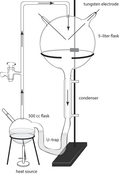 Figure 1.3. Schematic of the reaction vessel and ancillary equipment used in the Urey-Miller experiments. Distilled water was placed in a 500 cc flask that was heated to release water vapor that was cycled into a 5 liter flask containing a mixture of gases mimicking Earth’s ancient reducing atmosphere. The gas mixture (water, methane, ammonia, and hydrogen) was exposed to continuous electrical discharge by means of two tungsten electrodes to mimic lightening. The chemical reactants occurring in the atmosphere precipitated as “rain” and were collected in a U-trap. The arrows placed in various parts of the schematic show th...