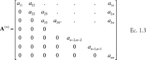 Para conseguir la estructura triangular superior se procede a eliminar los elementos bajo la diagonal principal, haciéndolos cero a través de operaciones (sumas y restas) con las filas de la matriz A. Al final del procesamiento se obtiene la siguiente estructura de matriz: