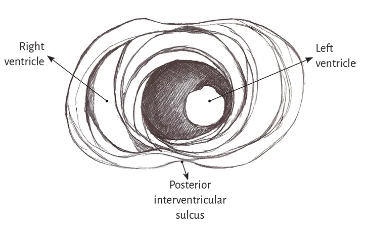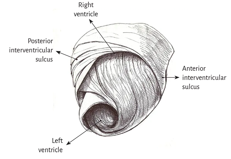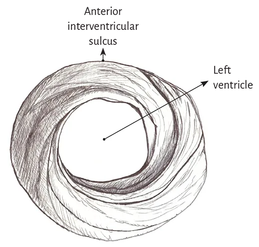 Left ventricle. The entire apex belongs to the left ventricle. In the distal part of the left ventricle, called apical, a muscle layer with spiral trajectory extends from the surface to the center and undergoes a rotation that turns the subepicardial fibers into subendocardial fibers, overlapping like the tiles of a roof. Consequently, the left ventricular distal end, the apex, surrounds a virtual conduit with no muscular plane at its ultimate end, lined internally by the endocardium and externally by the epicardium, with no intermediary muscle. It is essential to consider that in the apex the fibers undergo a helical rotational motion with sphincter-like arrangement as they transform from subepicardial to subendocardial fibers, following a clockwise trajectory (apical view of the diaphragmatic surface of the heart in the anatomical position) (Figures 1.5 and 1.6). (105)