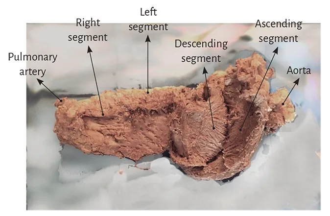 Regarding the argued difficulty to dissect the myocardium, which is more apparent than real (128), we should consider that once the myocardial band originated as a loop in the arterial semicircle of amphibians and reptiles to adapt to the physiological demands of aerial life, the muscle bundles became firmly attached to their contact surfaces, hampering the necessary cleavage planes necessary for their anatomical dissection. The evolutionary goal was to develop a sufficiently solid hemodynamic structure with the strength to generate the suction and pumping of the blood volume that supplied the whole organism. Thus, every attempt to dissect an anatomical segment from the rest of the myocardium, avoiding the real cardiac arrangement, always turns into an obstacle due to the structural plan of the axes where the orientation of the myocardial band courses.