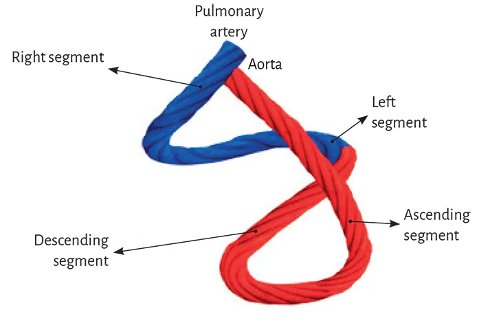 Torrent Guasp demonstrated through numerous dissections of hearts from different species, including humans, that the ventricular myocardium is formed by an assembly of fibers coiled unto themselves similarly to a rope (rope model) (Figures 1.1 to 1.4) and flattened laterally as a band, which by giving two spiral turns defines a helix limiting both ventricles and setting their performance. (2, 3) This structure is supported by the evolutionary process taking place from the primitive circulatory duct of the annelids to that of mammals, whose arterial circuit forms a loop or fold that twists unto itself giving rise to the ventricular chambers. The primary duct lumen establishes a secondary communication between both adjacent chambers (ventricles) formed by the loop, assuming that the side of the duct where the interconnection takes place must have cleaved all along the duct to achieve this purpose.