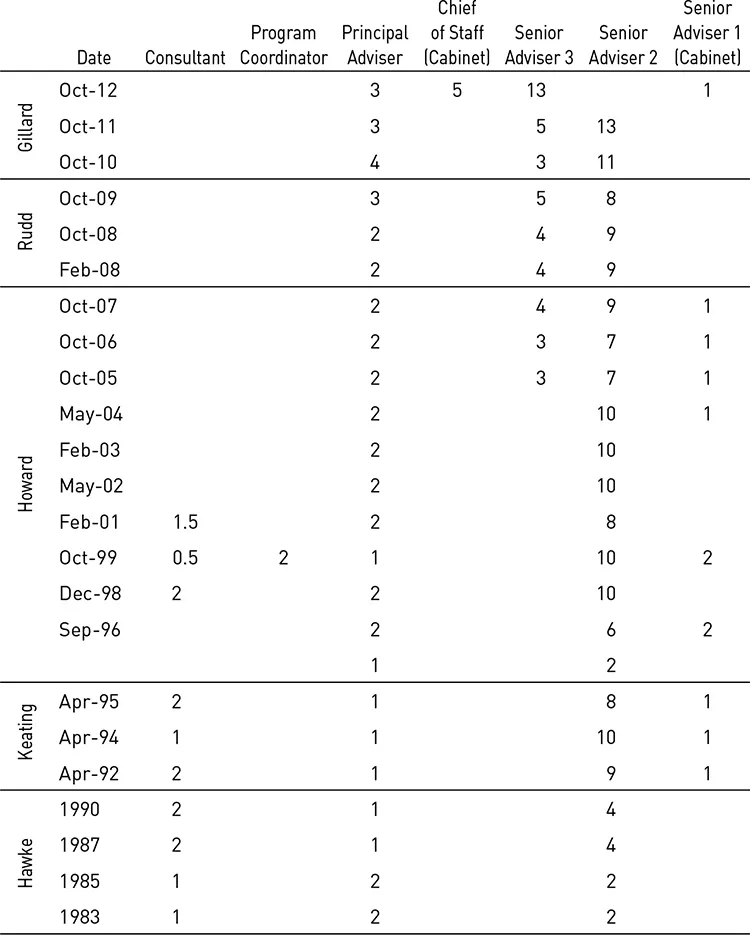 Centralisation is not the only criticism. Much concern is expressed about the growth in political appointments and the expansion of the PMO under recent Australian prime ministers. The table and organisation charts on pp. 6â9 show the growth in both staff numbers and the increasingly diverse responsibilities of the CoS and PMO from 1983â2013. Leaders have been the primary drivers of these changes, but the move to the new Parliament House in 1988 was also decisive. The design provided additional space to accommodate a larger, more functionally specialised prime ministerial support staff. These developments have been essentially bi-partisan. Each prime minister has built on the foundations of their predecessor in fashioning the modern hybrid advisory system that includes a large, active and partisan PMO and non-partisan career officials in the Department of the Prime Minister and Cabinet (PM&C).