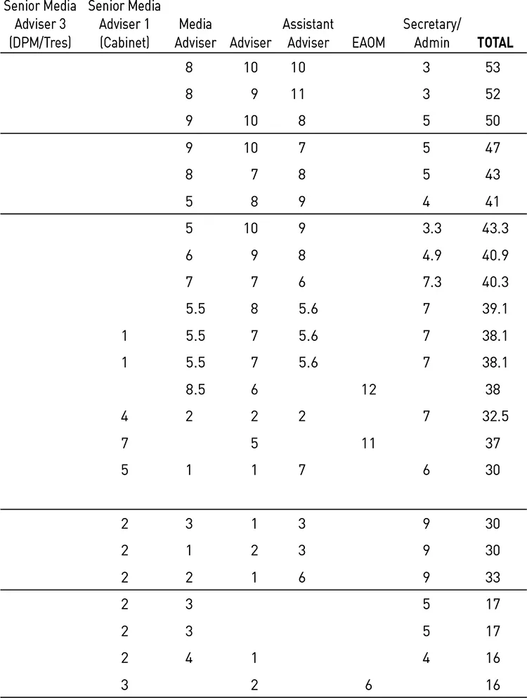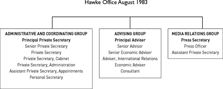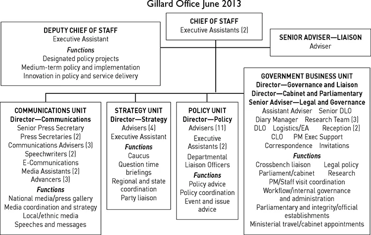 AT THE HEART OF government are people employed to help prime ministers do their job. Perhaps the most crucial appointment is the prime ministerâs chief of staff (CoS). This person sets the tone of how the Prime Ministerâs Office (PMO) runs and how their boss works. The CoS has a broad remit, but there is no job description. They support both the person who is prime minister and the position that they hold. They run the private office, which now has more than fifty staff and operates twenty-four hours a day every day of the year. The CoS tries to ensure the prime minister sets priorities and sticks to them, notwithstanding that crises and unexpected events will inevitably demand their time and attention. They help the prime minister to control the agenda, coordinate policy initiatives and maintain effective relation ships with the cabinet, the ministry, the party room, the media and the public service.