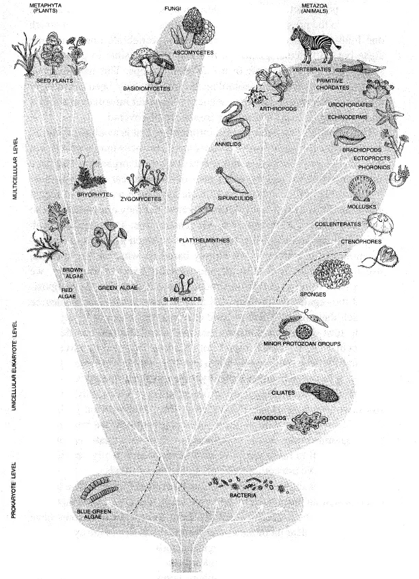 A modern example of such a tree can be seen in Figure 1. The lowest level, which includes bacteria and blue-green algae (or cyanobacteria), is well established. Morphologically these so-called prokaryotes have no nuclei or nuclear membrane, and their DNA is free in the cytoplasm. In this respect, and in other cytological details, they differ significantly from all higher organisms, or eukaryotes. Furthermore, as already pointed out, the earliest fossil organisms known are bacteria (3.4 billion years ago) and the first known blue-green algae are almost as old (2.7 billion years ago). The time of the origin of eukaryotes is not known, but it is presumed to be more recent. The earliest shelled protozoa (the foraminfera), which could hardly have been the first eukaryotes, are found in rocks over 500 million years old.