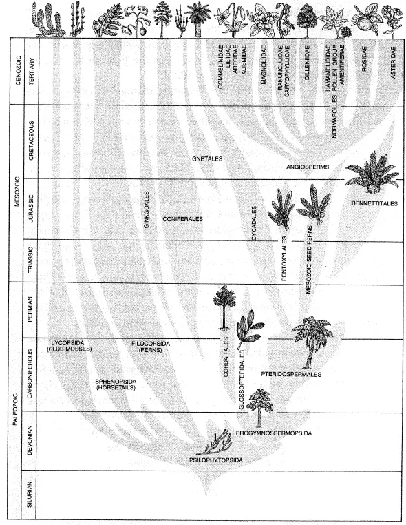 Fig. 2. A possible evolutionary tree of the evolution of plants from the Devonian to today. (From Valentine 1978, Copyright © by Scientific American.)