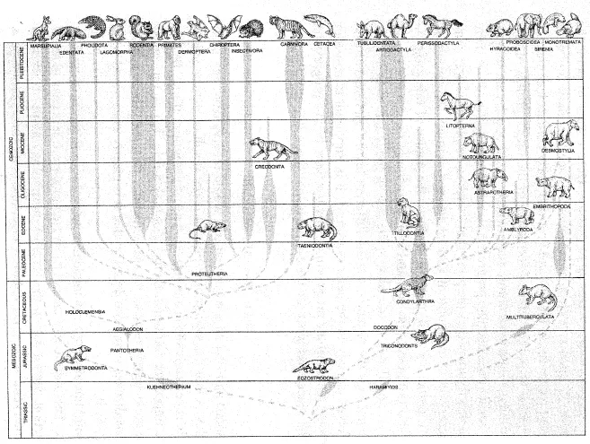 Fig. 3. An evolutionary tree showing the history of mammals. The early forms were all small and coexisted with dinosaurs, including some of the first primates. (From Valentine 1978, Copyright © by Scientific American.)