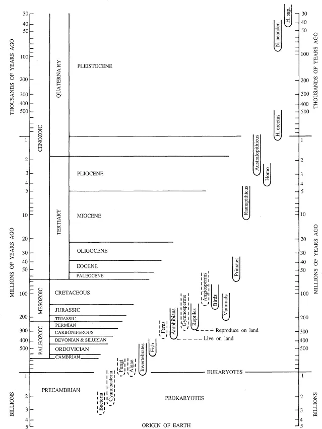 Fig. 4. A chart drawn on a logarithmic scale of the history of life on earth showing the time of the beginning of each major group of organisms, from bacteria to man. Plants are indicated by dashed lines; animals by solid lines. Note that the logarithmic scale greatly compresses the changes that o...
