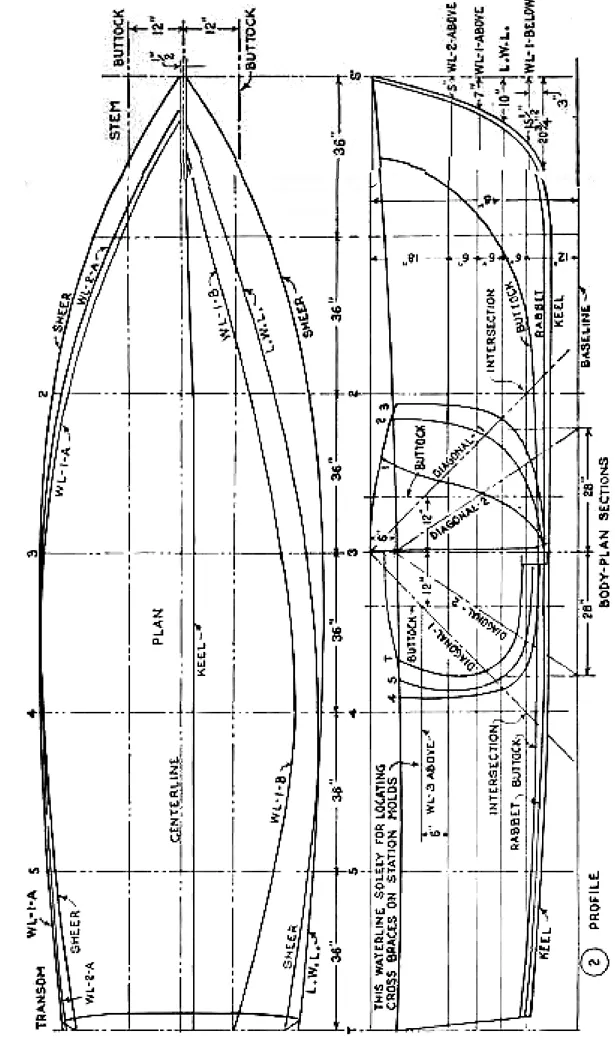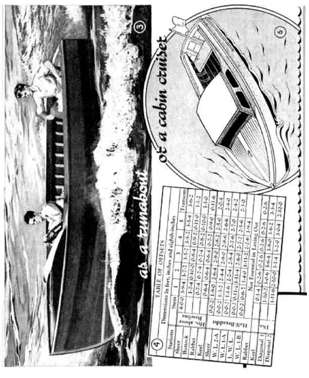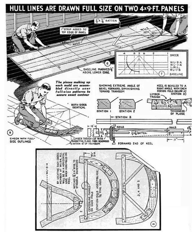 BEFORE starting actual construction on the hull, which is the same for either the runabout or cabin cruiser, Figs. 3 and 5, the plan, profile and the body sections Fig. 2 are drawn full size on two plywood panels placed end to end on the floor as in Fig. 6. A 1-in. strip added to the top edge of the panels will enable you to work from a baseline drawn 1/2 in. up from the bottom edge. Referring to Fig. 2, first mark off the vertical stations, which are spaced 36 in. apart. Then draw the five waterlines, the diagonals and finally the buttock lines. Use a thin batten to obtain a sweeping curve while an assistant does the marking. For the sake of clearness in the plan view, Fig. 2, some of the lines such as the sheer, WL-1-A and WL-2-A, are shown above the centerline, while others are below. However, in a full-size layout, all lines can be drawn above the centerline, making it necessary to draw but half of the plan. To explain how the table of offsets, Fig. 4, is used in determining the shape of the five molds, an example is given in Fig. 7 for finding the outline of station mold No. 3. In the offset table under āhalf breadthsā you will note that the dimension at the sheer line is given as 2-9-0, which means 2 ft., 9 in. and no eighth inches. This distance is marked from the centerline on the plywood panel. Follow this method for the four waterlines, then the distances given for the diagonals. Next drive a nail at each mark and bend a thin batten around them to trace the curve, as shown in Fig. 10.